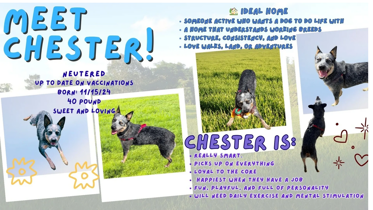 If you’re looking for a fun, affectionate, and devoted best friend, Chester might be your guy.
